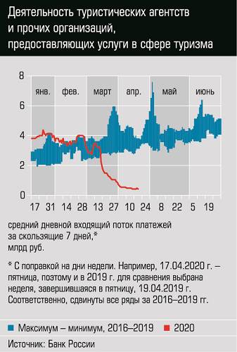 Наиболее сильное увеличение разрыва с «нормальным» уровнем наблюдалось в секторах, ориентированных на промежуточное потребление и инвестиции, что, по мнению ЦБ, может являться результатом постепенного распространения первичных внешних и внутренних шоков спроса и предложения через межотраслевые связи, а также отражает высокую волатильность недельных потоков в этих отраслях. Из отраслей конечного спроса сильнее всех пострадали гостиничные услуги, общественное питание, перевозки и туризм. На приведенном здесь графике входящих финансовых потоков туристической отрасли хорошо видно, как кривая в середине марта резко ныряет вниз, проваливаясь существенно ниже минимума диапазона фактических значений 2016–2019 годов.