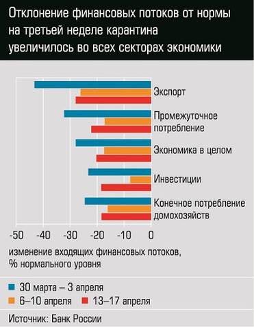 Согласно расчетам аналитиков регулятора, отклонение объема входящих платежей вниз от «нормального» уровня за третью нерабочую неделю (с 13 по 17 апреля) выросло до 20,4% с 17,4% на второй нерабочей неделе (с 6 по 10 апреля). Хотя платежные показатели второй недели, как в целом по экономике, так и по всем крупным направлениям использования ВВП (потребление домохозяйств, инвестиции, экспорт), выглядели существенно лучше, чем на первой неделе (30 марта — 3 апреля). В качестве точки отсчета («нормы») ЦБ использует средненедельные значения 2016–2019 годов.