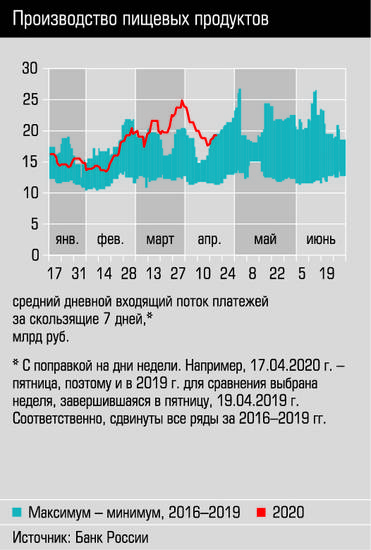 В то же время, скажем, производство пищевых продуктов, напротив, в тот же период демонстрирует платежную активность выше максимумов референтного периода. Однако и здесь на третьей нерабочей неделе апреля объем входящих платежей отклонился вниз от «нормального» уровня. После всплеска спроса в марте на фоне закупки впрок многих товаров первой необходимости и длительного хранения снижение продаж было ожидаемым. Постепенное истощение запасов приводит к восстановлению уровня розничных продаж, по крайней мере в продовольственном сегменте.
