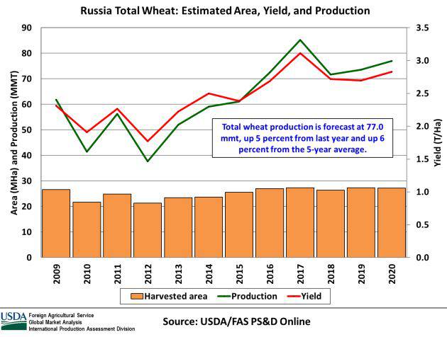 Прогноз по сбору Россией в 2020 году 77 млн тонн пшеницы вполне реалистичный, полагает глава люксембургского офиса консалтинговой группы KRK Group Никита Рябинин, так как это вполне сопоставимо с прошлогодним урожаем 74,4 млн. По крайней мере, нет оснований предполагать, что цифры будут ниже показателей 2019 года. Ранее были сведения о том, что в основных регионах производства зерновых культур, в частности в Ставропольском крае, наблюдался дефицит влаги, и это немного понизило прогнозы отечественных аналитиков.