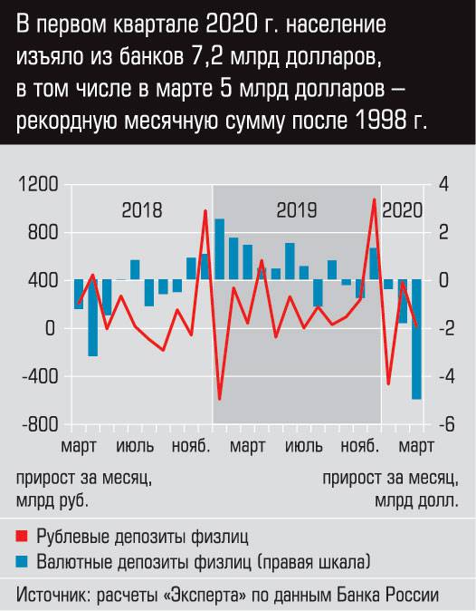 Ну а с валютными вкладами физлиц вообще творилось нечто невообразимое: их отток за первый квартал достиг 7,2 млрд долларов, как легко посчитать на основе открытой статистики ЦБ, в том числе в одном только марте — 4,99 млрд долларов (5,3%). Это максимальный месячный отток средств с валютных депозитов физлиц после кризиса 1998 года. Квартальный же отток можно сопоставить только с бегством от валютных вкладов в кризис 2014 года — тогда в целом за период с марта 2014-го по январь 2015 года депозитная база в инвалюте похудела, с «откатами» в некоторые месяцы, на 10 млрд долларов.