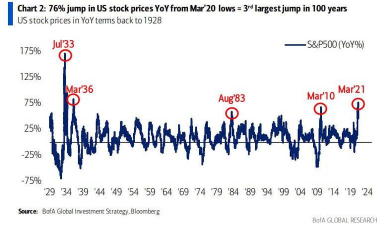 В своем свежем обзоре Bank of America отмечает, что от минимумов марта 2020 года индекс широкого рынка S&P 500 вырос почти на 80% — такой стремительный подъем за год в 100-летней истории был зафиксирован лишь трижды.