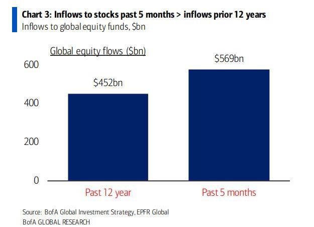 Это действительно становится похоже на некую манию или, если хотите, лихорадку. Чтобы убедиться в этом, достаточно взглянуть на действительно шокирующие цифры — глобальный приток средств в акции за последние 5 месяцев составил 602 млрд долларов и превышает суммарный приток за предыдущие 12 лет (452 млрд долларов).