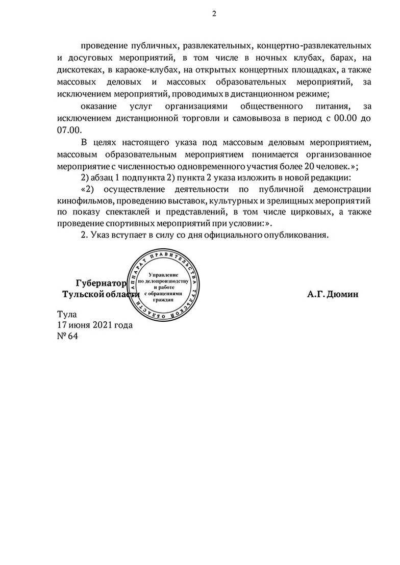 В связи с опубликованными изменениями от 17 июня 2021 в Указе Губорнатора Тульской области №62 все массовые мероприятия, в том числе фестиваль "Дикая Мята", отменены. Поправки вошли в силу со дня опубликования - с 17 июня 2021 года.
