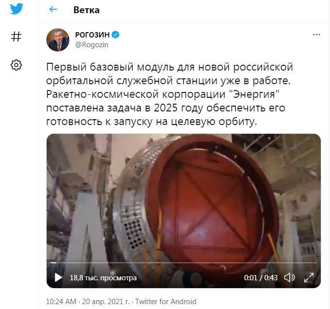 Рогозин 21 апреля нынешнего года в своем Твиттере выложил видео, демонстрирующее научно-энергетический модуль, и написал: «Первый базовый модуль для новой российской орбитальной служебной станции уже в работе. Ракетно-космической корпорации "Энергия" поставлена задача в 2025 году обеспечить его готовность к запуску на целевую орбиту».