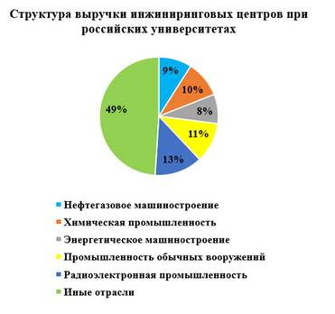 Анализ отраслевой структуры выручки университетских инжиниринговых центров свидетельствует, что в основном инжиниринговые центры сотрудничают с крупными предприятиями. Наиболее востребованными направлениями продукции и услуг являются радиоэлектронная промышленность, промышленность обычных вооружений, химическая промышленность, энергетическое машиностроение и нефтегазовое машиностроение.