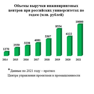 В 2021 году объем оказанных университетским инжинирингом услуг превысит показатель 2019 года на 15% и составит свыше 10 миллиардов рублей. Несмотря на некоторый спад в 2020 году, связанный с эпидемией коронавируса, тенденции последних нескольких месяцев свидетельствуют об активном оживлении сегмента коммерциализации научно-технологических разработок. «Общая тенденция свидетельствует об эффективности сотрудничества инжиниринговых центров и бизнеса, и я уверен, что это взаимодействие будет успешно развиваться», - отметил заместитель министра промышленности и торговли Российской Федерации Алексей Ученов в интервью «Эксперту».