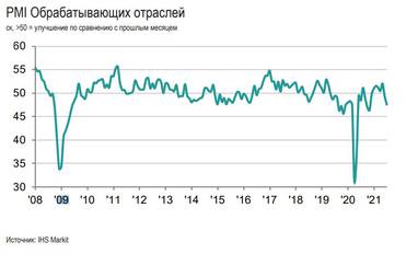 «Сезонно скорректированный Индекс IHS Markit PMI (индекс деловой активности – ред.Expert.ru) обрабатывающих отраслей России, который отслеживает общую конъюнктуру рынка, опустился с июньского показателя 49,2 баллов и составил в июле 47,5. Последнее падение деловой конъюнктуры в производственном секторе России было вторым максимальным и наиболее резким с ноября 2020 года. Данные за июль указали на возобновление сокращения в производственном секторе, а также на первое такое падение за семь месяцев. В целом темпы снижения были стабильными и самыми резкими с мая 2020 года», — сообщила компания по его итогам.