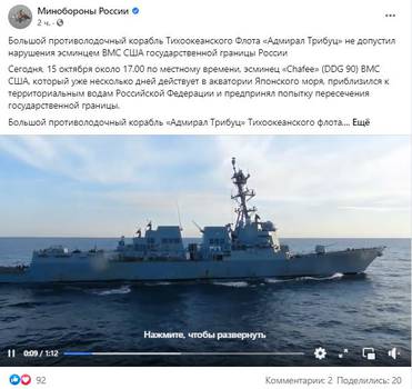 «Сегодня, 15 октября, около 17:00 по местному времени эсминец Chafee (DDG 90) ВМС США, который уже несколько дней действует в акватории Японского моря, приблизился к территориальным водам Российской Федерации и предпринял попытку пересечения государственной границы», — отметили в Минобороны РФ.