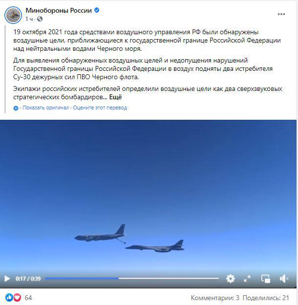 По данным военных, средства контроля воздушного пространства над нейтральными водами Черного моря обнаружили американские бомбардировщики. Истребители Су-30 поднялись в воздух и не дали иностранным самолетам нарушить российскую границу. «Полет российских самолетов выполнялся в строгом соответствии с международными правилами использования воздушного пространства», — подчеркнули в НЦУО.