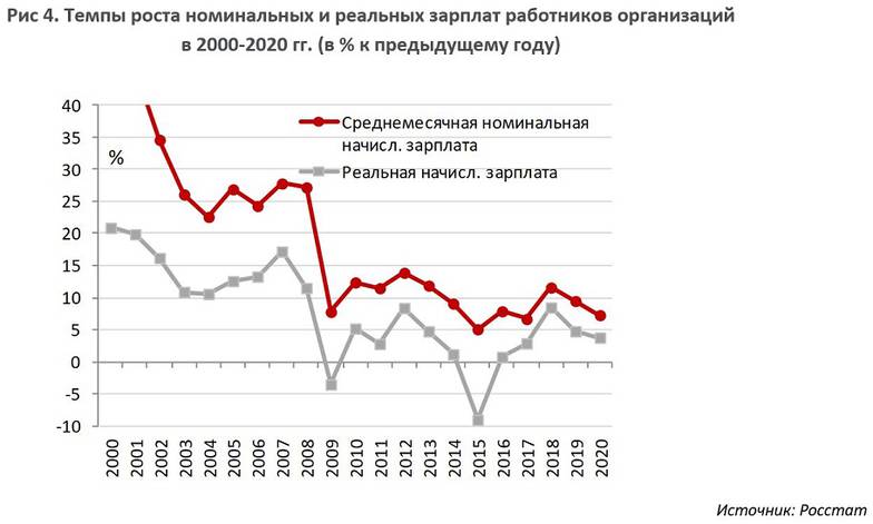 В I полугодии 2021 г. номинальная зарплата увеличилась на 9,4%, а реальная – на 3,4% в годовом выражении. В июле 2021 г. (последние доступные данные) среднемесячная начисленная заработная плата работников организаций составила 55 170 руб. Однако нужно учитывать, что эти данные отражают только зарплаты на крупных и средних предприятиях, а не по экономике в целом.