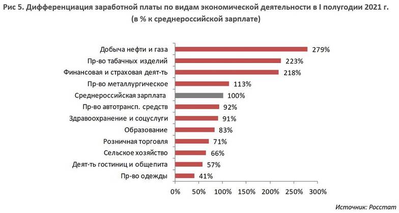 Отраслевые различия в уровне зарплаты тоже очень велики. В одних видах деятельности заработная плата в 2-2,8 раза превышает средний уровень по стране – это добыча нефти и природного газа, производство табачных изделий, финансовая и страховая деятельность. В других же зарплата на 30-60% ниже средней по стране (например, розничная торговля, сельское хозяйство, деятельность гостиниц и общепита, производство одежды).