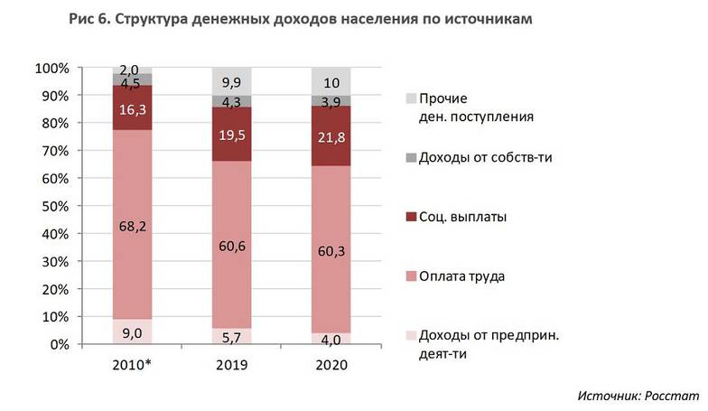 По сравнению с 2010 г., в 2019 г. доля доходов от предпринимательской деятельности сократилась в 1,6 раза, а в 2020 г. – в 2,25 раза. Если в 2010 г. у населения 9% доходов формировалось за счет предпринимательской деятельности, то в 2020 г. – только 4%. При этом вклад социальных выплат за период с 2010 по 2020 гг. увеличился с 16,3% до 21,8% (оставшаяся часть приходится на зарплату, доходы от собственности и прочие денежные поступления) (см рис. 6).