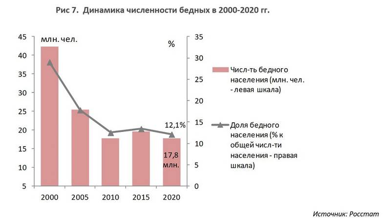 Денежные выплаты гражданам в период пандемии позволили не допустить роста бедности. За счет этого в 2020 г. было зафиксировано даже небольшое снижение доли бедного населения – до 12,1% (или 17,8 млн. человек) по сравнению с 12,3% в 2019 г. Однако в I полугодии 2021 г. доля бедного населения вновь выросла до 13,1%.