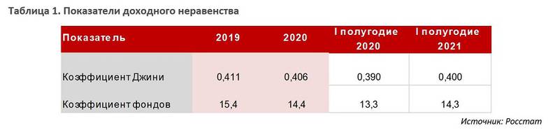 Коэффициент фондов (показывает отношение доли дохода, принадлежащей 10% наиболее обеспеченной части населения, к доле дохода, принадлежащей 10% наименее обеспеченного населения) в I полугодии 2021 г. вырос до 14,3 против 13,3 годом ранее (см. таблицу 1).