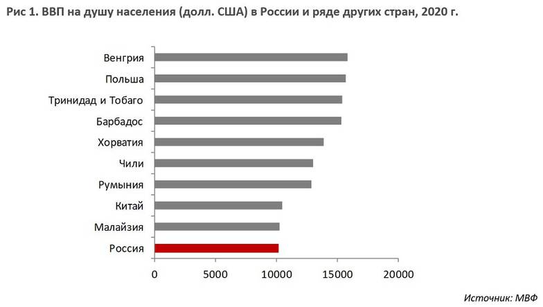 По данным МВФ, в 2020 г. по показателю ВВП на душу населения Россия занимала 66-е место среди 195 стран мира. Это на 8 позиций ниже, чем было в 2010 г. Сейчас по уровню ВВП на душу населения Россию опережают такие страны как Румыния, Чили, Хорватия, Барбадос, Тринидад и Тобаго, Польша, Венгрия. Если в России в 2020 г. подушевой ВВП составлял около 10,1 тыс. долл. США, то в указанных странах – 12,9-15,9 тыс. долл. США (см. рис. 1).