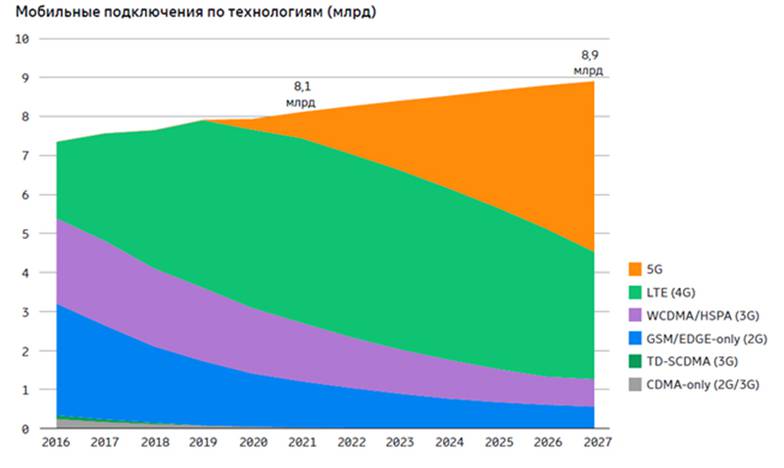 При этом повсеместное распространение сетей 4G и появление сетей 5G с их широкими возможностями привело к закату устаревших технологий, таких как 2G и 3G. В перспективе все больший частотный ресурс будет перераспределяться в пользу 4G и 5G. Согласно прогнозу Ericsson, к концу 2027 года технология пятого поколения станет доминирующей — в мире будет 4,4 млрд 5G-подключений, а доля устройств 5G в общем объеме мобильных подключений приблизится к 49%, а на сети 5G будет приходиться 62% мирового трафика данных.