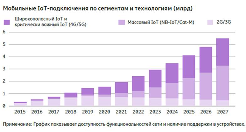Еще одно направление развития технологии 4G и 5G - устройства широкополосного интернета вещей (IoT). Преимущества широкополосного IoT - высокая пропускная способность, низкая задержка и возможность передавать большие объемы данных. К концу 2027 года доля широкополосных подключений в сегменте мобильного интернета вещей достигнет 40%, при этом большая часть этих подключений будет приходиться на сети 4G. Скорости передачи данных в этом сегменте будут расти по мере развертывания технологий 5G NR в старых и новых частотных диапазонах.