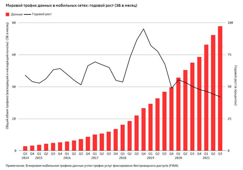 Уже сегодня смартфонами генерируется 97% мобильного трафика данных, и в ближайшие годы их доля в глобальном трафике продолжит расти. К концу 2021 года потребление трафика в расчете на один смартфон составит, в среднем, 11,4 ГБ в месяц, а к концу 2027 года вырастет до 41 ГБ в месяц. В настоящее время порядка 69% мобильного трафика данных приходится на видеоконтент, вклад которого будет расти и в 2027 году достигнет 79%.
