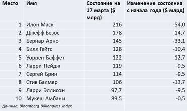 Но теперь «Оракул из Омахи», как его тоже называют, вновь оказался в лучах прожекторов. Уоррен Баффет 17 марта находился уже на 5-м месте в ренкинге Bloomberg Billionaires Index против 8-й позиции в конце января. Благодаря не прекратившемуся, в отличие от многих других акций, росту Berkshire Hathaway, он стал единственным из участников Top-10 богатейших людей мира, чье состояние в этом году выросло (см. таблицу 1).