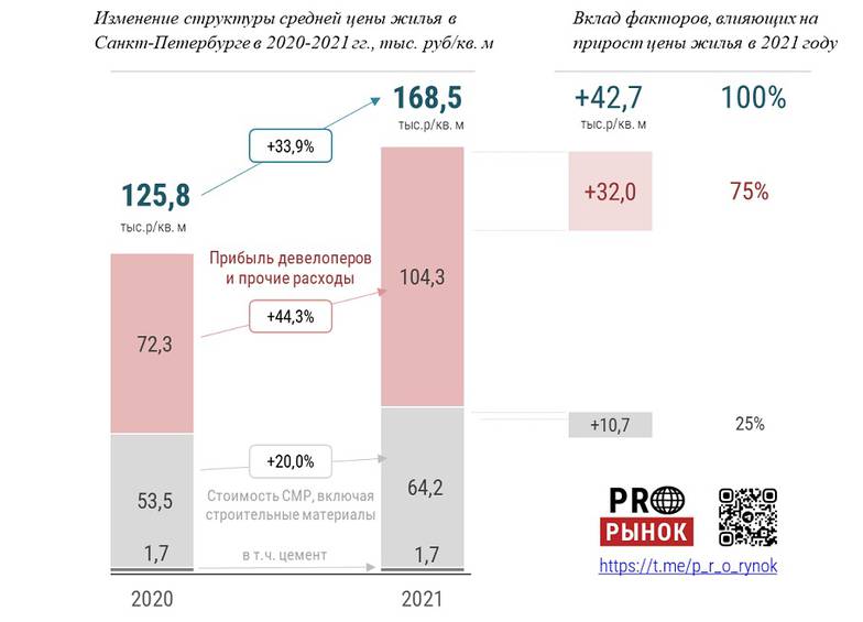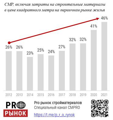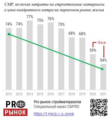Наши сомнения подкрепляются следующими данными: стоимость СМР, включая затраты на строительные материалы в стоимости квадратного метра на первичном рынке жилья за период с 2012 по 2021 год снизилась с 74 до 54 процентов, а прибыль девелоперов и затраты не связанные с СМР и строительными материалами в стоимости квадратного метра жилья за период с 2012 по 2021 год выросли с 26 до 46 процентов. Самые значительные изменения произошли за последние 3 года.