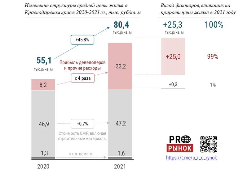 По данным ФСГС РФ средняя цена 1 кв. м общей площади квартир на первичном рынке жилья в Краснодарском крае в 2021 году выросла с 55 тысяч 139 рублей до 80 тысяч 418 рублей или на 25 тысяч 279 рублей. Средняя фактическая стоимость строительства одного квадратного метра общей площади жилых помещений выросла на 306 рублей. Весь рост стоимости жилья в Краснодарском крае произошел по причинам, не связанным с ростом стоимости строительных материалов.