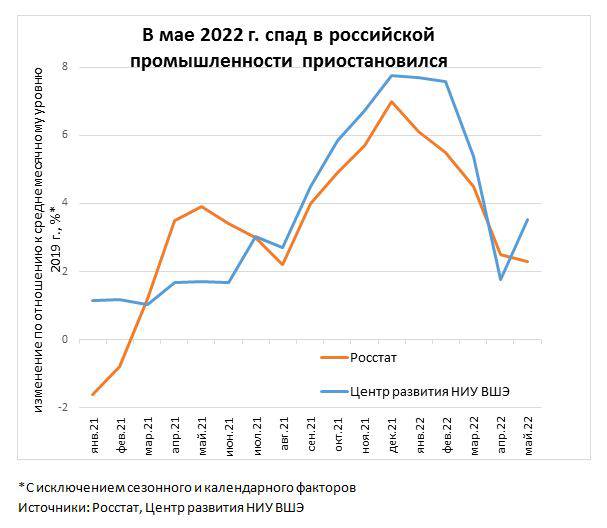 — Согласно нашим оценкам, индекс российского промышленного производства с поправкой на календарный и сезонный факторы после достижения пиковых значений в декабре-феврале, (заметно более высоких по сравнению с предковидным уровнем, в марте и апреле продемонстрировал заметный спад, после чего в мае несколько восстановился. Незначительный подъем в мае зарегистрирован как в добыче полезных ископаемых, так и в обрабатывающих производствах. Это может быть признаком того, что производители в первом приближении адаптировались к шокам, вызванным антироссийскими санкциями.