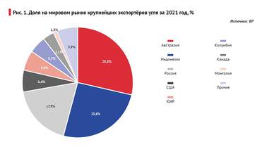 Во-первых — и в главных, — на нашу страну по итогам прошлого года пришлось 17,9% мирового экспорта угля (см. рис. 1). Таким образом, Россия расположилась на третьем месте по объемам поставок на международный рынок, пропустив вперед только Австралию и Индонезию. Кстати, на страны первой тройки приходится почти три четверти международных поставок.