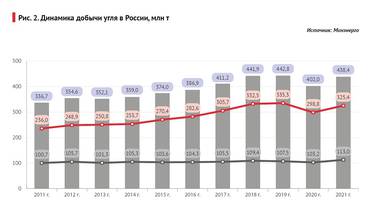 Если в 2019 году в России, по данным Минэнерго, было добыто 442,8 млн т угля, то в 2020-м этот показатель просел до 402 млн т, а в 2021-м увеличился до 438,4 млн т (см. рис. 2). По оценке министра энергетики РФ Николая Шульгинова, которую он озвучил в ходе июльской встречи с Владимиром Путиным, динамика добычи угля в первом полугодии 2022-го соответствовала уровню прошлого года.