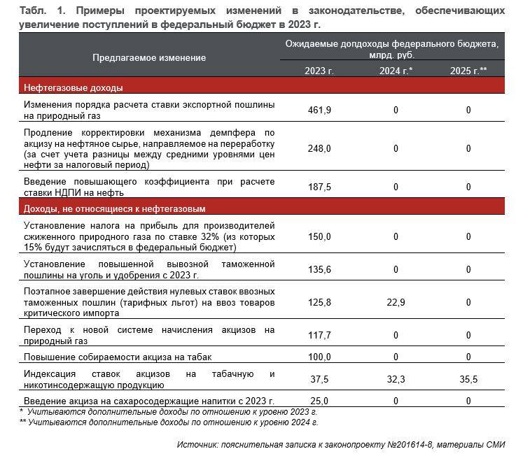 Предлагаемые изменения, относящиеся к доходам федерального бюджета, в основном направлены на повышение нагрузки на экономику. По логике Минфина, представленной в пояснительной записке к законопроекту №201614-8 «О федеральном бюджете на 2023 год и на плановый период 2024 и 2025 годов», в 2023 г. ожидается падение нефтегазовых доходов федерального бюджета на 2727,2 млрд руб., при этом доходы бюджета, не относящиеся к нефтегазовым, должны вырасти на 1164,3 млрд руб. Значительный вклад в прирост доходов при этом будет приходиться на «проектируемые изменения в законодательстве» (см. табл. 1).