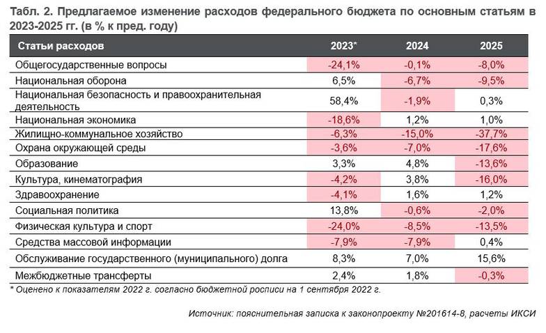 Несмотря на то, что суммарные расходы федерального бюджета предлагается оставить в 2023-2025 гг. практически неизменными по сравнению с 2022 г., законопроект о федеральном бюджете предполагает несколько серьезных изменений в структуре расходов (см. табл. 2). В частности, в 2023 г. планируется 58,4%-ное увеличение расходов по разделу «национальная безопасность и правоохранительная деятельность» (в связи с переоснащением и расширением финансирования МЧС, МВД, Росгвардии, судебных органов и т.д.), а также 13,8%-ное увеличение расходов на социальную политику (что связано прежде всего с индексацией пенсий, выплатой пособий семьям с детьми). В свою очередь, сокращение расходов в 2023 г. по сравнению с 2022 г. планируется провести по целому ряду разделов федерального бюджета, включая раздел «общегосударственные вопросы», «физическая культура и спорт», «национальная экономика», ЖКХ, «здравоохранение» и др.