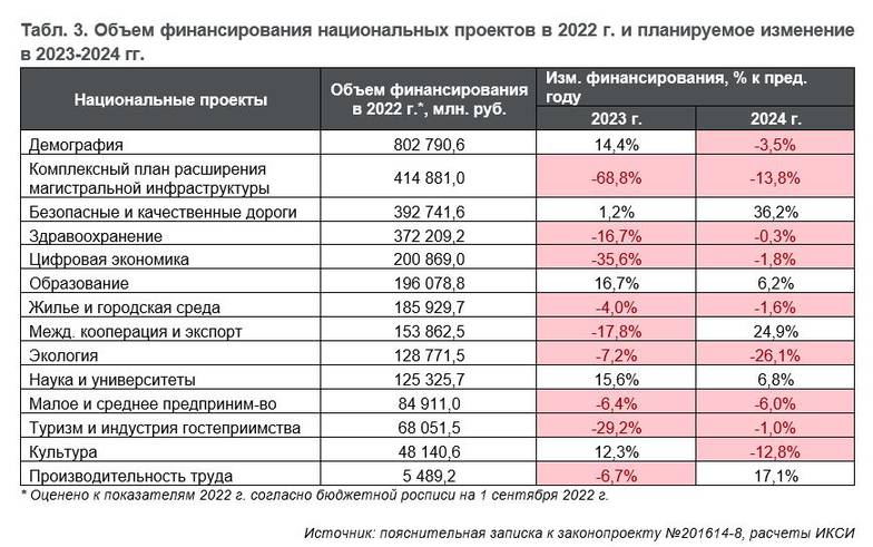 Важно отметить, что сокращение расходов затрагивает целый ряд национальных проектов, суммарные расходы на которые в рамках законопроекта о федеральном бюджете должны быть уменьшены в 2023 г. на 311,0 млрд руб. (см. табл. 3). Наиболее масштабное сокращение (на 68,8%, или на 285,5 млрд руб.) предлагается провести в отношении Комплексного плана расширения магистральной инфраструктуры, в рамках которого финансируются критически значимые для развития экономики инфраструктурные проекты (такие как федеральные автотрассы, инфраструктура ключевых морских портов, региональных аэропортов и др.). В 2024 г., согласно представленному плану, расходы на реализацию Комплексного плана должны сократиться еще на 13,8% по сравнению с уровнем 2023 г. Аналогичные действия по сокращению расходов предлагается провести в отношении национальных проектов «цифровая экономика», «жилье и городская среда», «экология», «туризм и индустрия гостеприимства» и др. Увеличение расходов запланировано только по 5 национальным проектам. Наиболее заметный рост расходов в 2023 г. планируется провести по национальному проекту «Демография» (увеличение расходов на 14,4%, или на 115,3 млрд руб.), а также «Образование» (увеличение на 16,7%, или на 32,7 млрд руб.). Само себе это не может не радовать.