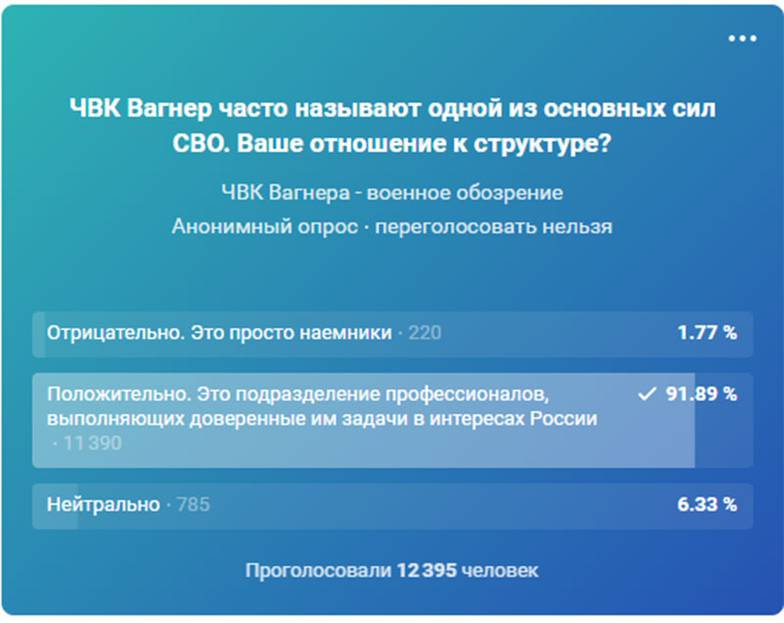 В паблике «ЧВК Вагнера — военное обозрение» состоялся опрос, посвященный отношению участников сообщества к привлечению российских добровольцев легендарного подразделения к специальной военной операции.
