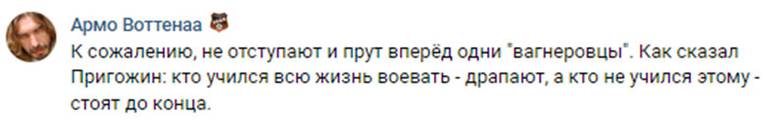 «Не отступают и прут вперед одни «вагнеровцы». Как сказал Пригожин: кто учился всю жизнь воевать - драпают, а кто не учился этому — стоят до конца», — пишет один из пользователей.