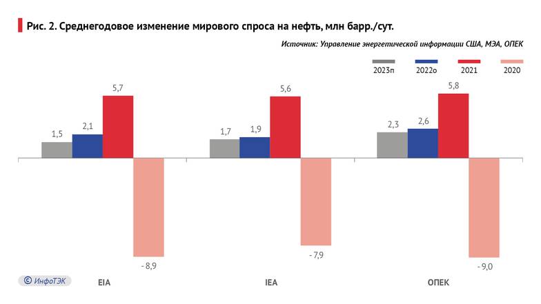 Рост мирового рынка нефти в 2023 году оптимистично оценивается в 1,5—2,3 млн барр/сут, что, как ни странно, выше среднего роста в доковидную эпоху, который составлял в среднем 1,5 млн барр/сут.