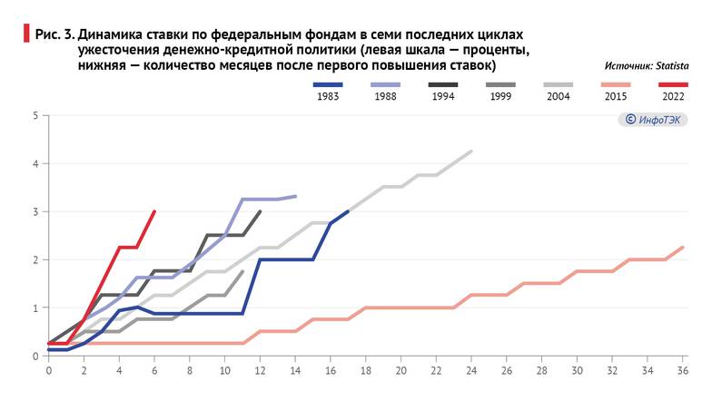 Повышения на 25 б. п. и 50 б. п. 16 марта и 4 мая не оказали охлаждающего эффекта на растущую цену нефти и инфляцию. Но уже переход к повышению на 75 б. п. в июне и июле совпал с началом снижения цен на нефть и инфляции в США (см. рис. 3).