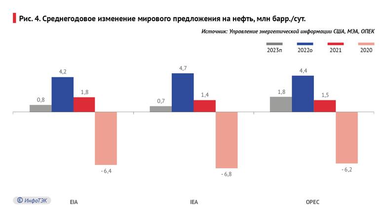 Как и прогнозы спроса, в октябре были пересмотрены прогнозы мирового предложения нефти, но в меньшей степени. . Их понижение на 2023 год составило 0,5—1,1%, а сами величины прироста прогнозируются на уровне 0,7—1,8 млн барр./сут.