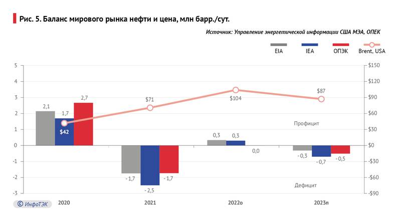 В среднем в текущем году мировой рынок нефти оказывается сбалансированным, особенно по сравнению с кризисным 2020 и посткризисным 2021 годами. В нынешнем году Управление энергетической информации США (EIA) и МЭА видят на рынке небольшой профицит в 0,3 млн барр/сут, а ОПЕК верит в идеальный баланс — мол, квоты снижены не зря. Благостную картину портят низкие коммерческие и стратегические запасы, которые следует пополнить, но они оказались за пределами дискуссии.