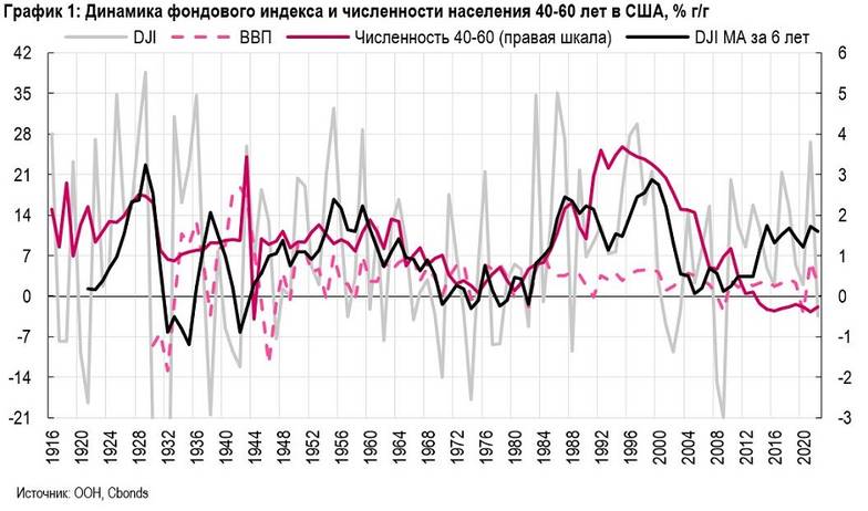 Для отражения потенциала растущих сбережений можно сконцентрироваться на возрастной группе потенциально самых активных сберегателей (инвесторов). Это может быть интервал возрастов «зрелых трудоспособных» — от 35-40 лет до 60-65 лет. Возрастные группы моложе этого интервала могут больше тратить (на детей, путешествия, обустройство дома) или занимать, а поколения старше 60-65 лет выходят на пенсию, а значит, начинают скорее тратить накопления. Для подтверждения гипотезы требуются длинные исторические ряды, поэтому обратимся к данным по США, Японии и Великобритании (начало данных с 1920-1980 гг.). Также будем ориентироваться на сглаженные показатели по росту фондового рынка, чтобы абстрагироваться от разовых шоков и коротких циклов (сглаживание составляло 5-7 лет — так современная экономическая мысль в основном оценивает среднюю длину экономического цикла). При всей упрощенности нашего анализа становится очевидной устойчивая связь между темпом роста численности 40-60 летних и средними темпами роста фондовых индексов. Рост фокус группы на 1% в год в среднем соответствовал ускорению среднего по циклу роста фондового рынка на 7-10% в год.