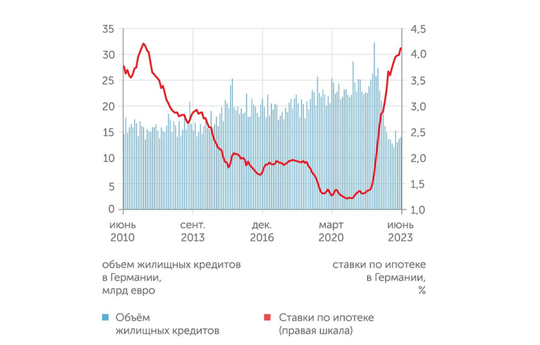 Кстати, по оценке Бундесбанка, банки Германии вообще чрезмерно повысили ставки по ипотеке — видимо, констатируют в регуляторе, немецкие банкиры оценили риски заемщиков как значительно более высокие из-за высокой инфляции и общей неопределенности. Свою роль также сыграли плохие перспективы рынка недвижимости.