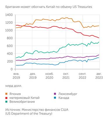Но не смотря на продажи Китая и Японии, объем госдолга на руках у иностранцев в абсолютных величинах даже растет. Все дело в том, что пока Китай и Япония сокращают свои портфели, их наращивают другие страны. Например, Британия ― за 12 месяцев с сентября 2022 по августа 2023 она нарастила объем US Treasuries у себя с 646,5 до 698,1 долл. Если так пойдет и дальше, то впервые за многие годы Великобритания может сместить материковый Китай со второго места среди держателей гособлигаций США (US Treasury Bonds).