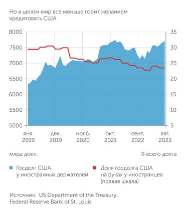 Что касается основного иностранного держателя госдолга США ― Японии, то она с сентября 2022 по август 2023 снизила объем американских бумаг у себя с 1196 до 1116,2 млрд долл. Впрочем, тут нужно учитывать, что пик вложений Японии пришелся на октябрь 2021 года (1325,5 млрд долл.) после чего шел сброс американских бумаг до нижней точки в октябре 2022 года (1064,4 млрд долл.), а сейчас страна восходящего солнца снова набирает американский долг, пусть и меньшими темпами.