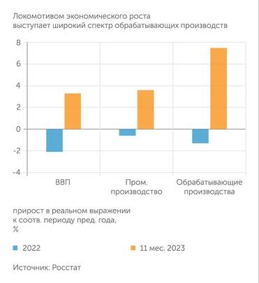 Рискуя утомить цифрами, приведем только самые яркие свидетельства форменного бума, развернувшегося в обрабатывающей индустрии. Химические вещества и продукты +6,4% (здесь и далее ― прирост выпуска в натуральном выражении 11 мес. 2023 года к 11 мес. 2022 года), резиновые и пластмассовые изделия +9,9%, автотранспортные средства, прицепы и полуприцепы +12,7%, вагоны пассажирские +15,0%, приборы полупроводниковые и их части +18,9%, тепловозы магистральные +19,8%, насосы +20,5%, трансформаторы электрические +23,0%, лифты +24,5%, вагоны грузовые +26,7%, кабели волоконно-оптические +28,0%, подшипники +28,5%, компьютеры, электронные и оптические изделия +34,7%.