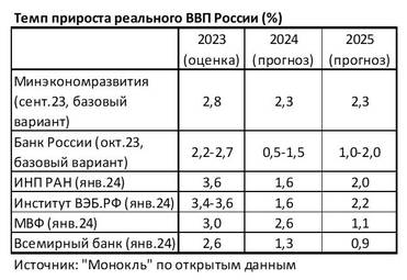 Отечественные экономические прогнозы на наступивший год заметно более консервативны, чем оценки МВФ. Базовый вариант сентябрьской (2023 года) версии прогноза Минэкономразвития дает оценку в 2,3% прироста ВВП в 2024 году, Банк России в прошлом октябре давал вилку в 0,5-1,5%. Институт ВЭБ.РФ и Институт народнохозяйственного прогнозирования РАН в своих свежих январских прогнозах единодушны — наш ВВП, по их расчетам, вырастет в наступившем году лишь на 1,6%. Еще более скромный прирост — 1,3% — дает Всемирный банк.