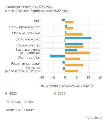 Сильные итоги показали обрабатывающие производства, показавшие прирост на 7,5% против скромных 0,3% в позапрошлом году. А вот добыча полезных ископаемых припала на 1,3%. Продолжился быстрый рост строительства — отрасль выросла на 7,9% против 7,5% в 2022 году. Ввод в действие жилья обновил рекорд, превысив 110 млн кв.м.