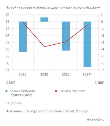 По оценкам Банка Израиля, военные расходы в 2023-2025 годах составят около 255 млрд шекелей, это 13% ВВП только в 2024 году. За этим последует и повышение дефицита бюджета, что потянет за собой рост госдолга вырастет до 67% ВВП.