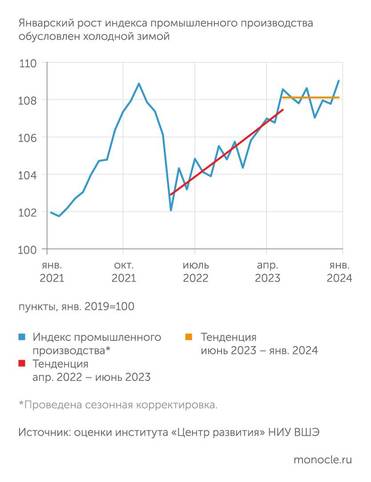 По мнению Бессонова, по итогам января можно говорить о сохранении тенденции стабилизации промышленного производства, сформированной в июне 2023 года. В добыче полезных ископаемых уровень производства после кратковременного санкционного спада в значительной мере восстановился с поправкой на сезонность еще в июне 2022 года, но затем почти год до лета 2023 г. вновь снижался, хотя и крайне низкими темпами. С июля здесь заметно восстановление невысокими темпами.