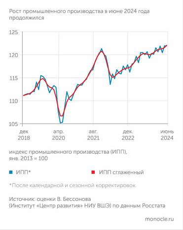 Июньские данные свидетельствуют о сохранении растущей тенденции промышленной динамики. Несмотря на то, что Росстат зафиксировал сокращение промышленного производства в июне по сравнению с маем на 1,9%, специалисты считают это не более, чем статистическим артефактом, связанным с недостаточно корректной очисткой исходного динамического ряда от влияния сезонного и календарного фактора (в июне 2024 года было 19 рабочих дней, а в июне прошлого года – 21).