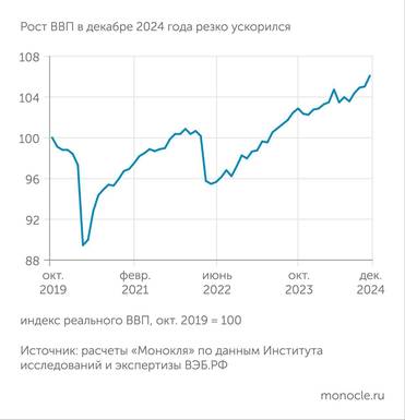 В четвертом квартале ВВП вырос на 1,4% по отношению к третьему кварталу. Это наибольший квартальный прирост в 2024 году. Экономика непрерывно растет уже десять кварталов подряд – с середины 2022 года. В четвертом квартале вновь усилился инвестиционный спрос, несмотря на ужесточение кредитных условий. Об этом свидетельствует неожиданное возобновление роста в строительстве. Кроме того, ускорился рост производства отечественного инвестиционного оборудования.
