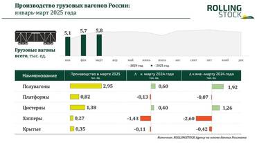 Так, в первом квартале этого года был выпущен 61 магистральный электровоз, что на 16,4% меньше, нежели в первом квартале 2024 года. Снижение производства магистральных тепловозов —17,7% (выпущено 65 секций), маневровых тепловозов — 57 единиц, снижение на 13,6%. Наибольшее снижение выпуска зафиксировано в секторе производства вагонов метро — 18,2%, всего 121 метровагон. При этом, по итогам марта было произведено в полтора раз меньше единиц этой техники по сравнению с мартом 2024 года.
